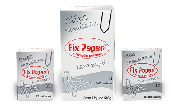 Os clips Fix Paper® ajudam a organizar os papéis, são indispensáveis no dia a dia dos escritórios, empresas e repartições públicas. São produzidos em aço com banho superficial de níquel. A produção da linha de clips niquelados melhora a identificação, proporciona ainda mais durabilidade e resistência.